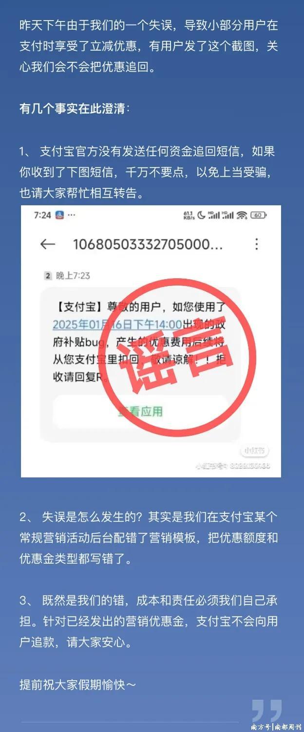 3.既然是我们的错,成本和责任必须我们自己承担。针对已经发出的营销优惠金,支付宝不会向用户追款,请大家安心。